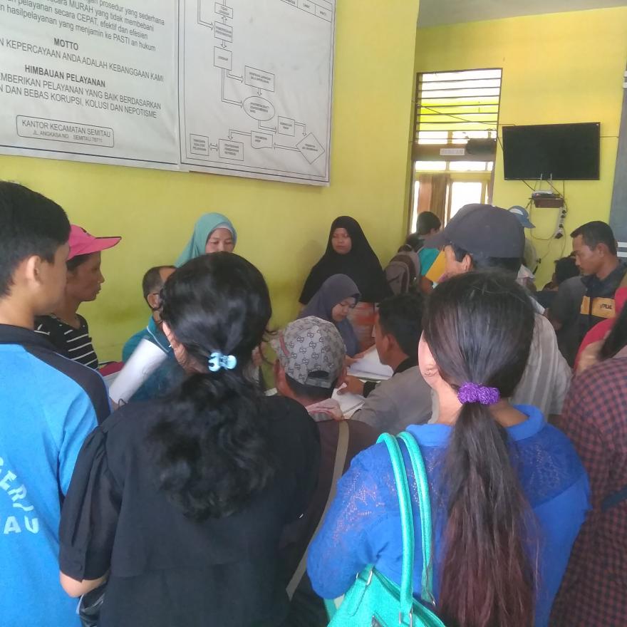 Semitau- Jumat 8 November 2019, ratusan warga tampak memadati halaman kantor camat semitau sejak pagi hari. Kehadiran ratusan warga tersebut bukan untuk melakukan aksi demonstrasi melainkan untuk mendapatkan layanan jemput bola administrasi kependudukan yang digelar oleh Dinas Kependudukan dan Catatan Sipil Kabupaten Kapuas Hulu di ruang Pelayanan Administrasi Terpadu Kecamatan (PATEN) kecamatan semitau.